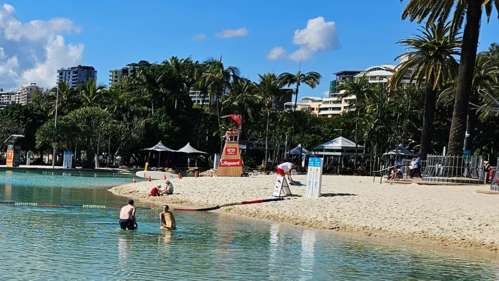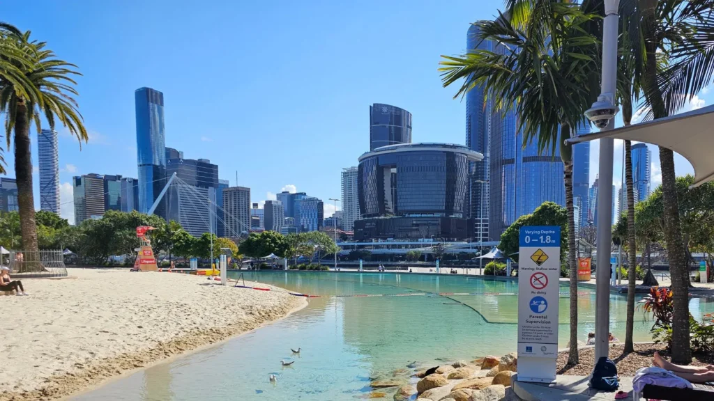 Streets Beach (South Bank, Brisbane) is Australia’s only inner-city man-made lagoon, complete with soft white sand, clear water, and skyline views. It’s a safe, family-friendly place to swim, relax, and cool off — with easy access to gardens, cafés, and Brisbane’s top cultural attractions.