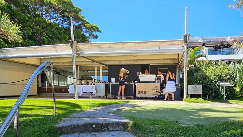 Coffee cart right on the beach. they also have fresh muffins and croissants and the like. Everything you need for a quick breakie after a n early morning swim. Sometimes here can be a huge line though.