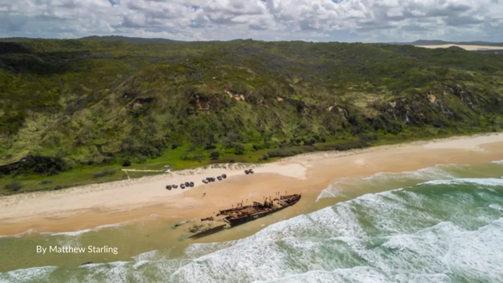 🌊 The rusted hull, half-buried in the sand, is now one of Fraser Island’s most photographed landmarks.
