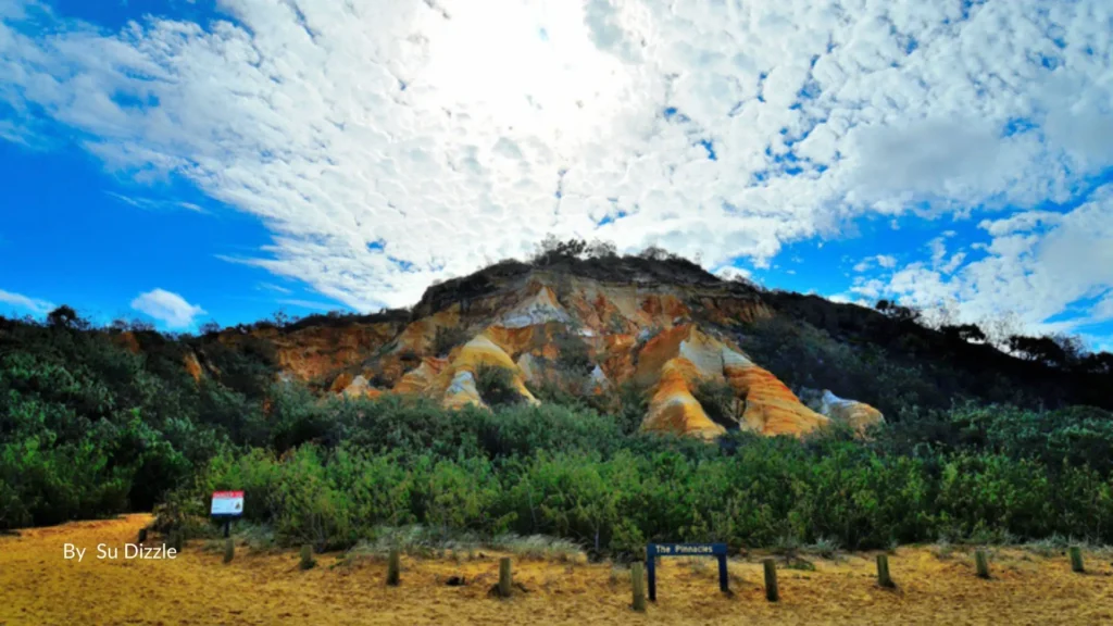 The Pinnacles, located along the eastern shoreline of Fraser Island (K’gari), are one of the island’s most spectacular natural formations — a towering collection of multicoloured sand cliffs rising dramatically beside the beach. With over 70 shades of red, orange, yellow, and white layered through the landscape, The Pinnacles are a must-see stop for photographers, 4WD adventurers, and visitors exploring the iconic 75 Mile Beach coastal highway.