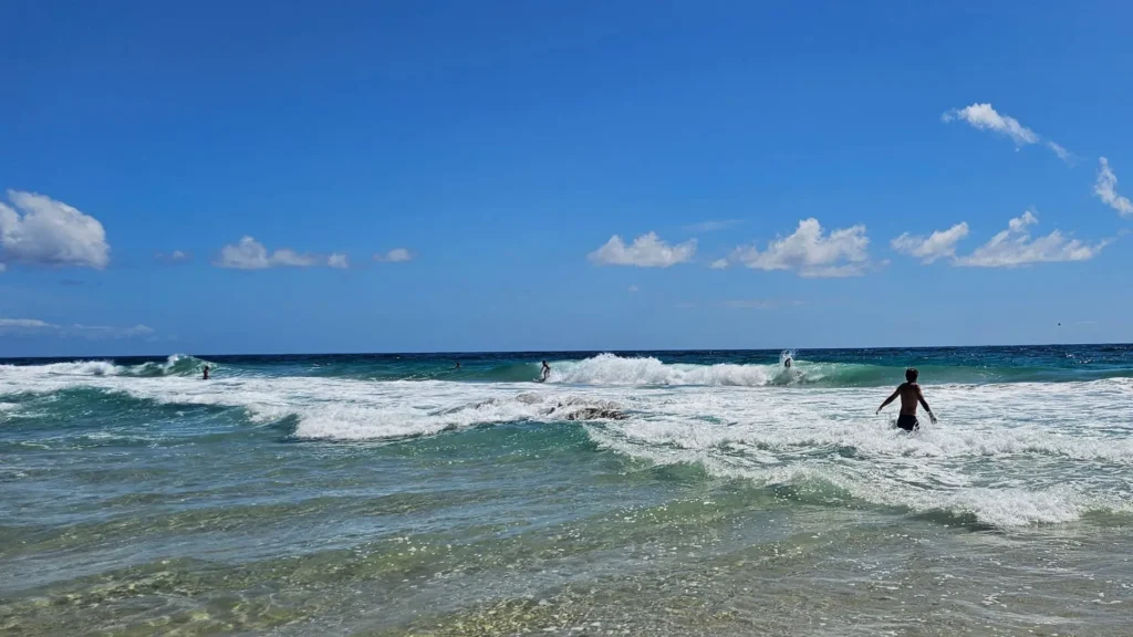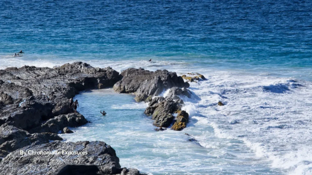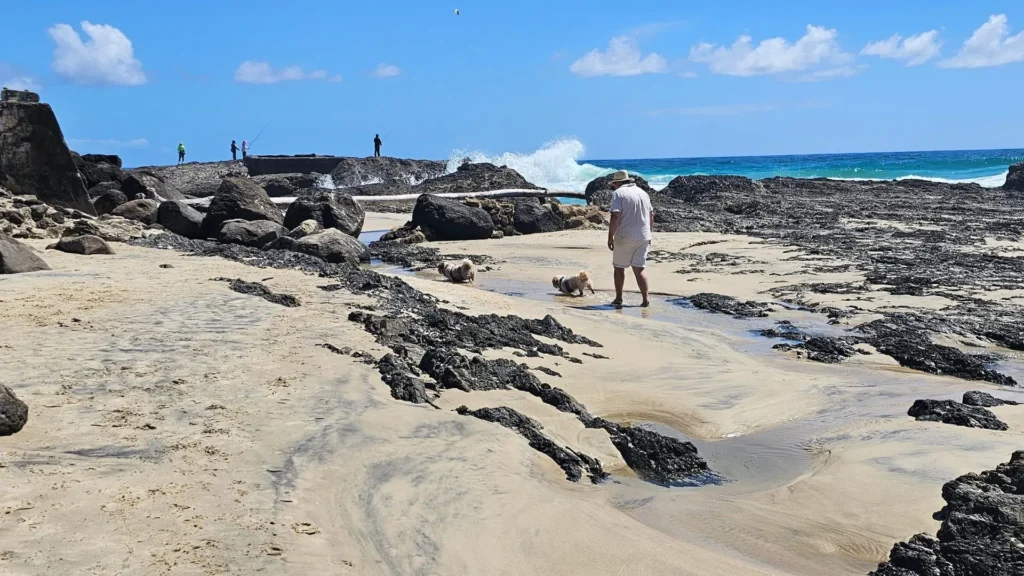 It’s considered a bit of a hidden beach โ quieter and less crowded than the main surf spots โ with a quirky local legend: a large rock overlooking the cove has been creatively painted green to resemble a big frog (hence the name “Froggies”), adding a fun, whimsical touch that locals love pointing out. Conditions vary by day โ on smaller swells or low tide, the water can be calm with a natural paddling pond forming in the shallows (great for relaxed wading or kids), but with decent southeast swells (common here), waves can wrap in and create rideable surf in the cove itself, attracting bodyboarders and surfers.