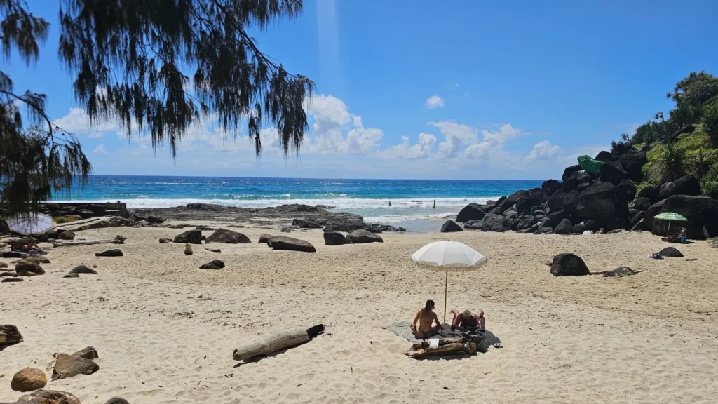Froggies Beach also known a Froggy’s Beach is a tiny, secluded cove and hidden gem tucked on the southern side of Snapper Rocks at the very southern end of the Gold Coast, right near the Queensland/NSW border and the base of Point Danger. This small sandy inlet offers clear waters and dramatic rocky scenery, making it a favourite locals’ spot for picnics, sunbathing, photography, or watching (and sometimes catching) waves at nearby Snapper Rocks and Duranbah.